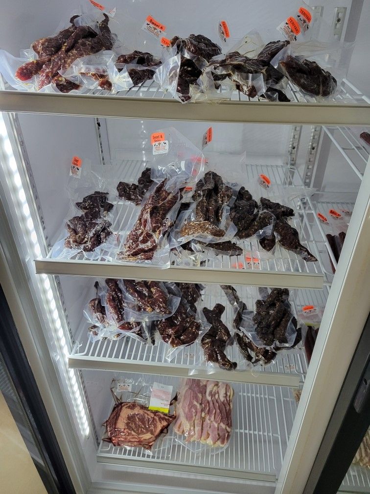- Beef jerky: Available in 7 flavors (mild, peppered, sweet and garlic, sweet and spicy, teriyaki, hot, habanero)*